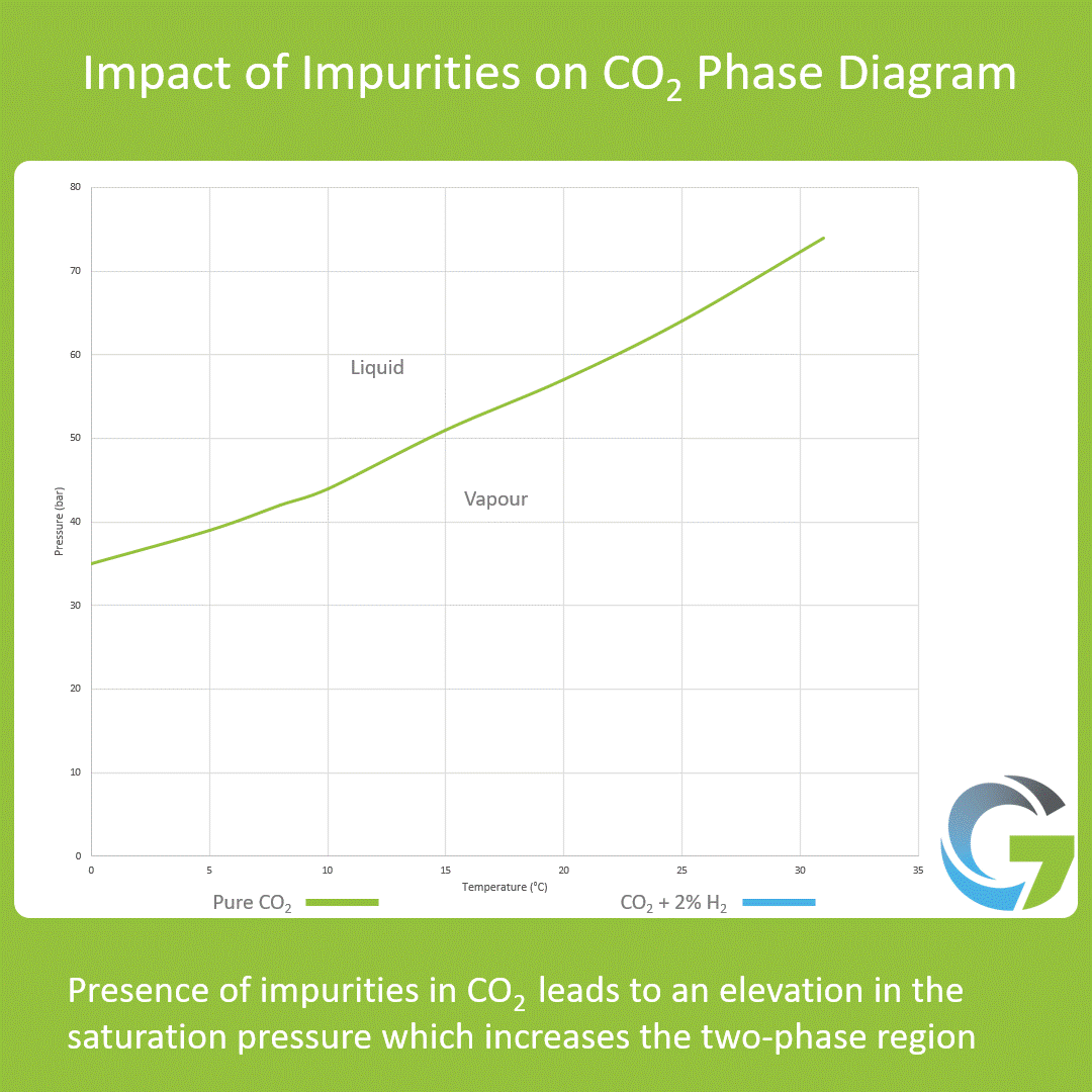 CO2 streams containing high amounts of hydrogen (H2), nitrogen (N2), argon (Ar), and oxygen (O2) will lower the quality of the dense phase by increasing the saturation pressure, thereby enlarging the two-phase parameters. H2 has the most pronounced effect in raising the saturation pressure, therefore high content can put greater restrictions on the operating envelope of the system. H2 embrittlement may also occur in a two-phase system which is why H2 content in the stream should be kept to under 2 mol%.