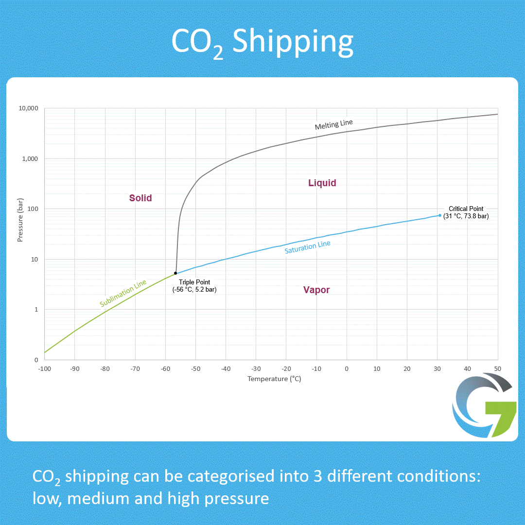 To transport CO2, which is normally gaseous at atmospheric conditions, it is liquefied to achieve higher shipping density. Different pressures and temperatures are used to liquify CO2 and these are categorised as 'low-pressure,' 'medium-pressure,' and 'high-pressure', as shown on the phase diagram.
