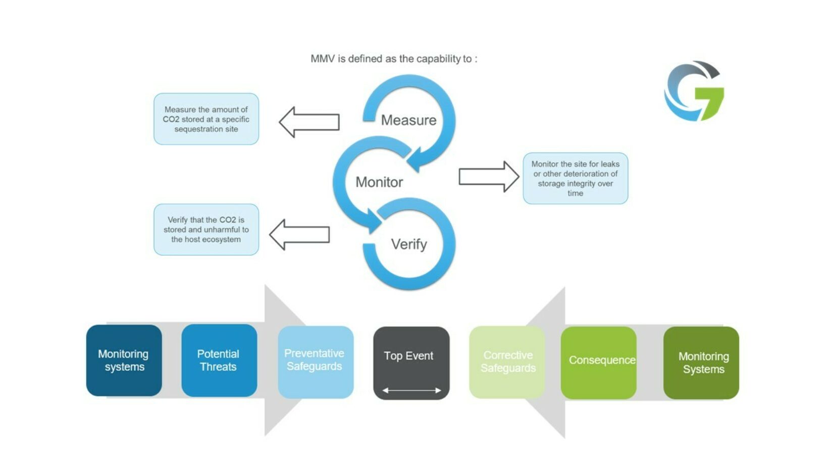 MMV could be based on a bowtie containment risk assessment where potential mechanisms that could lead to loss of containment are investigated, and mitigation options are identified. Barriers to reduce the likelihood of a hazard escalation (i.e., a leakage event) can take the form of monitoring technologies combined with corrective actions. Monitoring technologies in an MMV programme are comprehensive and cover all relevant phases (pre-injection, injection and post-injection) and domains (marine environment, geosphere, wells, etc.)